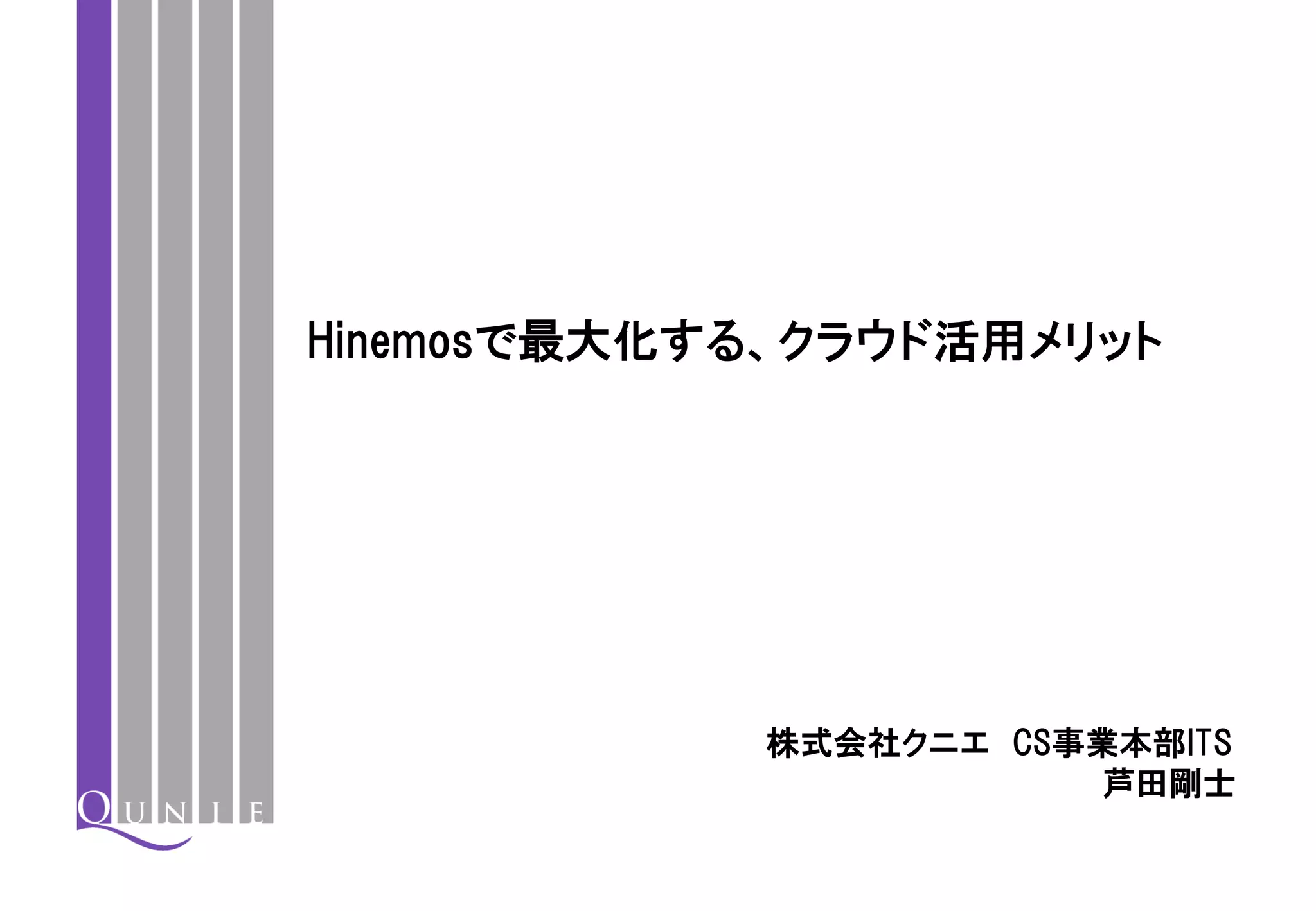 Hinemosは、システム運用管理で要求される各種機能を備えた、「統合運用管理ソフトウェア」です。 本資料は、2017/1/27(金)開催 Hinemos World in OSAKA 『Hinemosで最大化する、クラウド活用メリット』セッション講演資料となります。
