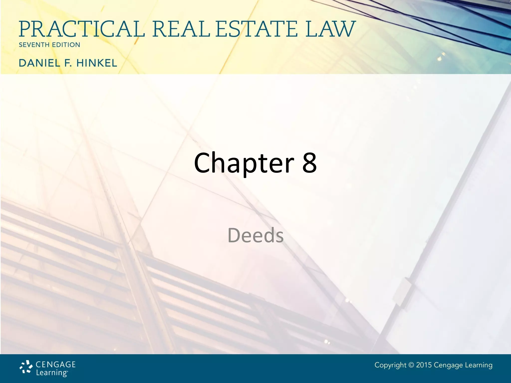 This chapter outlines the types of deeds used in modern real estate, their historical development, and the essential requirements for creating a valid deed. It discusses various deed types, such as general warranty deeds, limited warranty deeds, and quitclaim deeds, along with the principles of preparation, correction, and ethical considerations in deed creation. Proper identification of grantors and grantees, legal descriptions, and witnessing requirements are emphasized as critical components for validity in deed preparation.