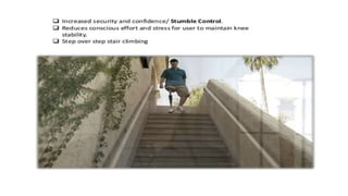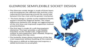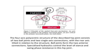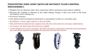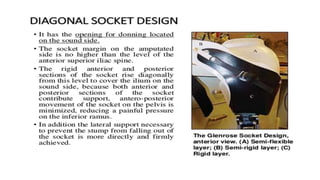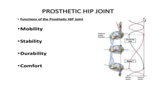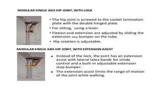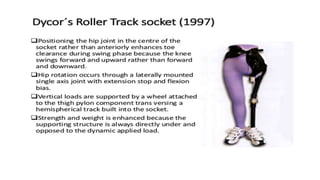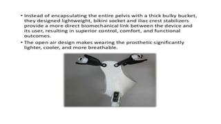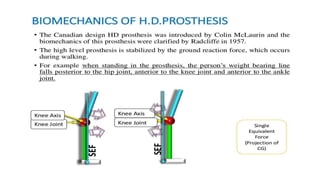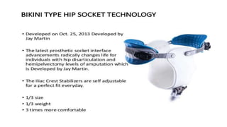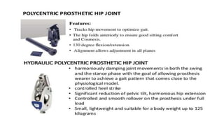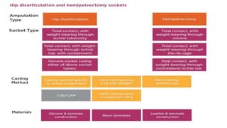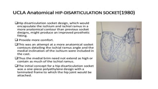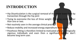 This document provides information about hip disarticulation prostheses. It begins by defining hip disarticulation as the surgical removal of the entire lower limb through the hip joint. It then discusses some key challenges with hip disarticulation including reduced mobility and increased energy expenditure during walking. The document outlines the main causes of hip disarticulation amputation and notes that only 20% of patients use a prosthetic leg full time. It provides an overview of the evolution of hip disarticulation prosthesis designs. The document details important considerations for prosthetic management of hip disarticulation including patient evaluation, casting techniques, socket design, components, alignment, and training.