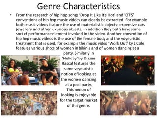 The document discusses genre characteristics and conventions of hip hop music videos based on analysis of specific music videos. Some key conventions discussed include use of luxury items, performance elements, voyeuristic treatment of women, amplified relationships between lyrics and visuals, illustrative relationships between music and visuals, use of close-ups to introduce artists, and intertextual references. The document analyzes several music videos to identify and examine these conventions.