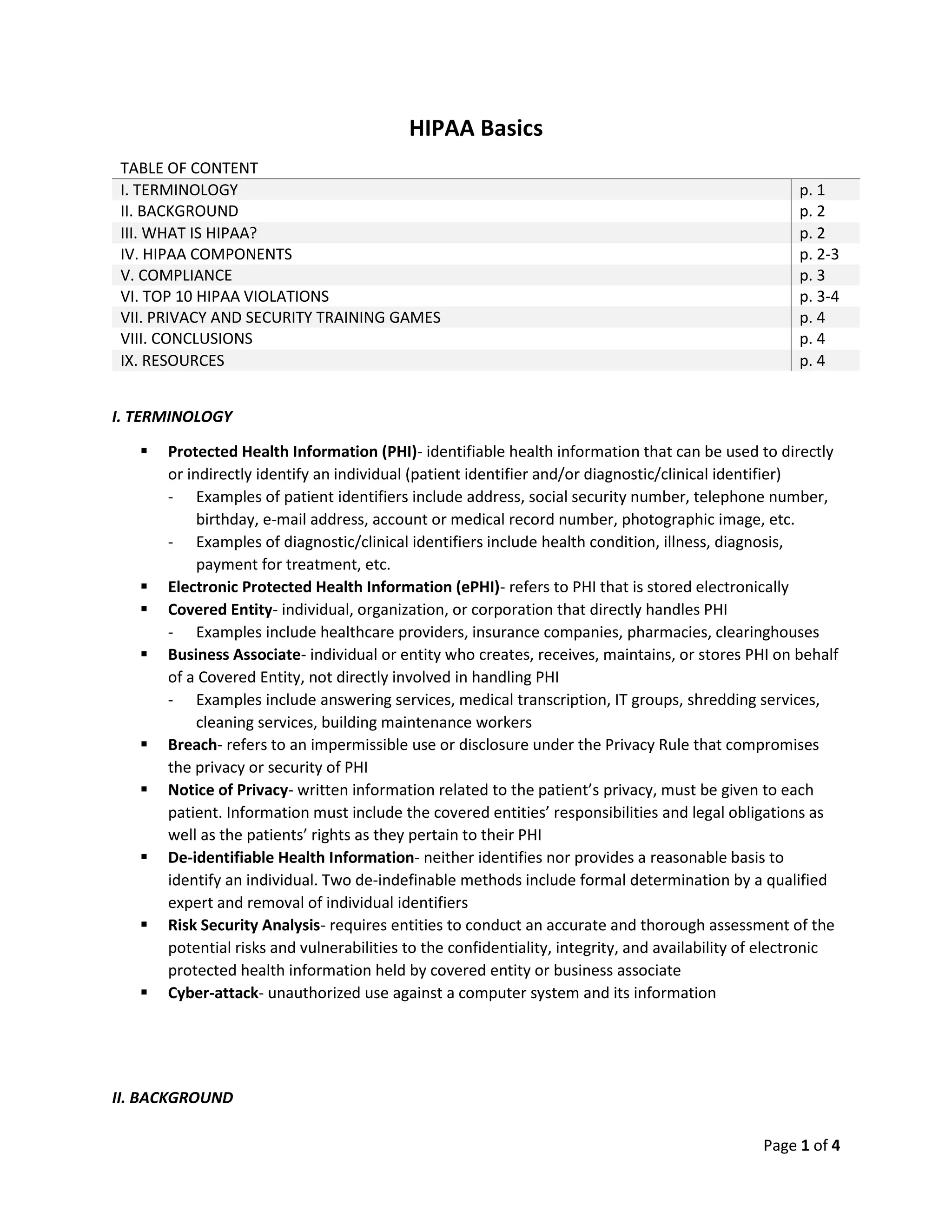 The document provides an overview of HIPAA basics, including key terminology, the background and purpose of HIPAA, its main components and requirements, compliance strategies, common violations, and additional resources. Specifically, it outlines the Privacy Rule for protecting personal health information, the Security Rule for securing electronic data, and how the HITECH Act expanded enforcement. It emphasizes the importance of conducting risk analyses, implementing documentation like policies and procedures, and providing annual employee training to ensure HIPAA compliance.