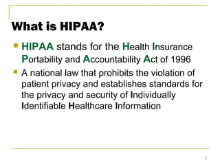 HIPAA establishes national standards to protect patients' personal health information. It applies to covered entities like health care providers and insurers, as well as their business associates. HIPAA protects individuals' medical records and other personal health information by setting rules for use and disclosure of protected health information. It provides patients rights over their health information including rights to examine and obtain a copy of their records, and to request corrections. HIPAA also protects security of health information whether stored electronically or on paper. Violations of HIPAA can result in fines and penalties.