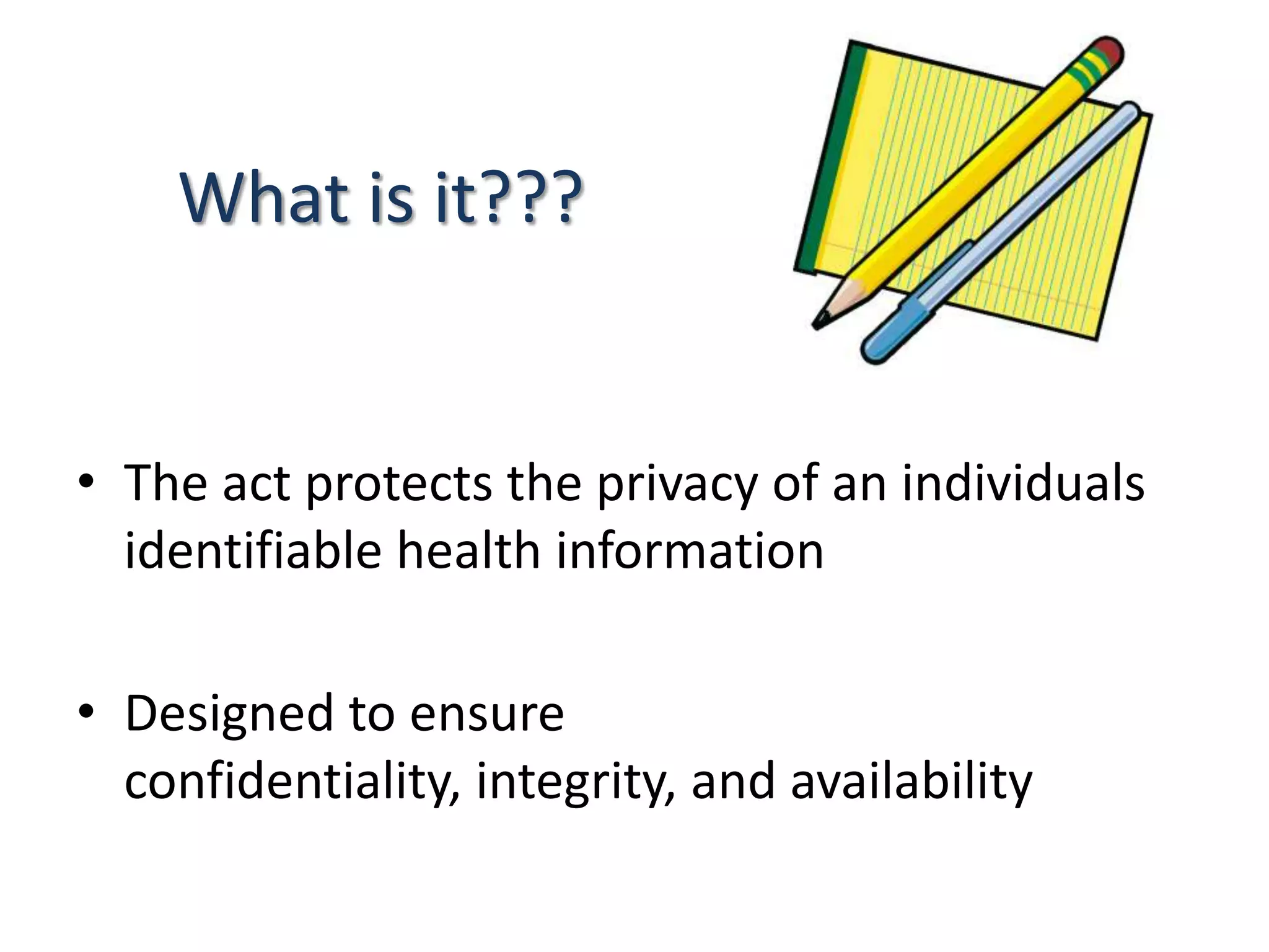 The Health Insurance Portability and Accountability Act (HIPAA) of 1996 protects individuals' private health information. It applies to covered entities like health care providers, insurers, and clearinghouses that store, transmit, or use protected health information. All employees, volunteers, trainees, agents and contractors of covered entities must follow HIPAA rules. HIPAA covers identifiable health information like names, dates, diagnoses, and treatments. The Department of Health and Human Services enforces HIPAA through investigations and compliance reviews, with civil penalties up to $1.5 million and criminal penalties including imprisonment.