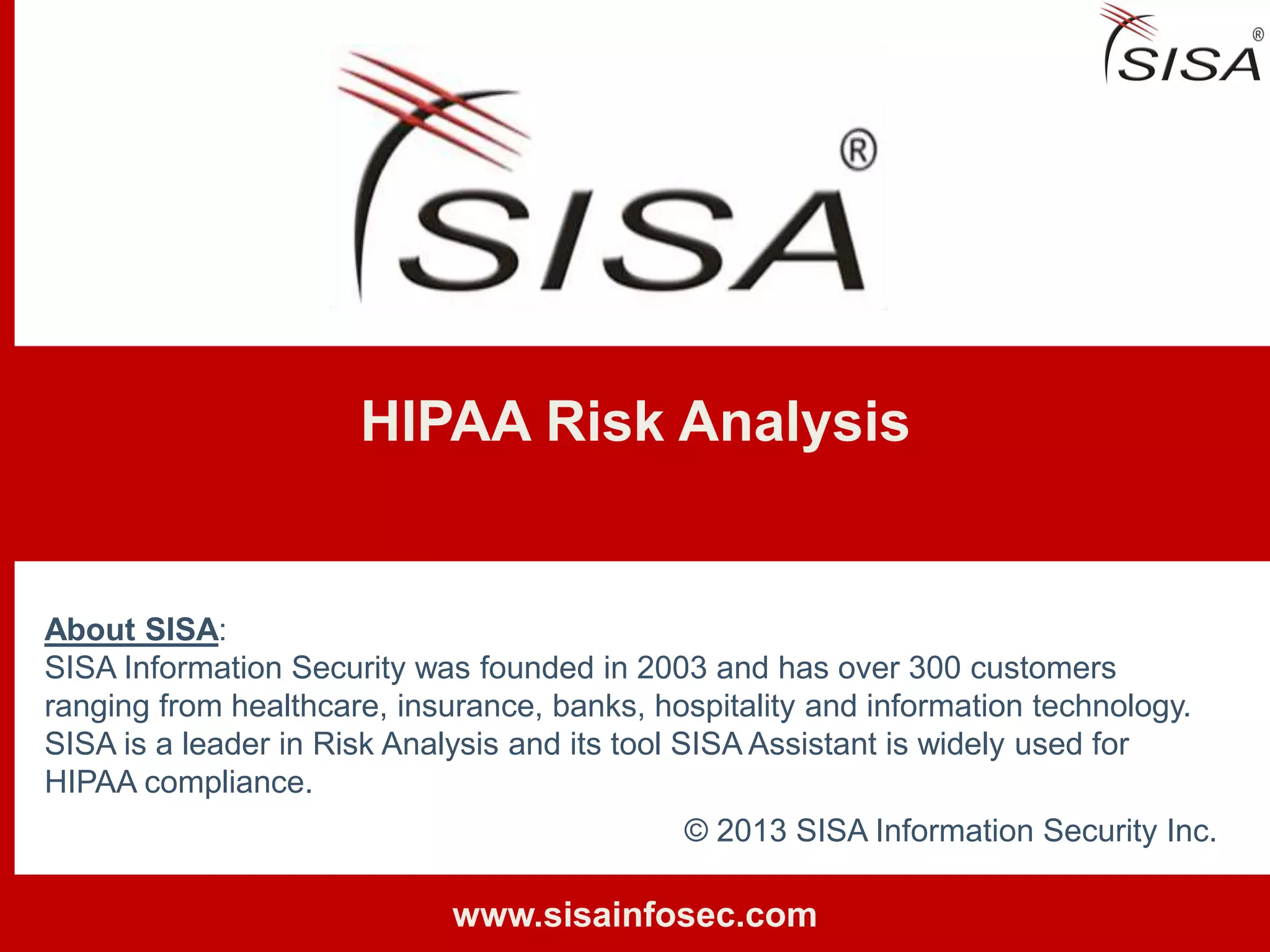 Sisa Information Security Inc., founded in 2003, specializes in risk analysis with a focus on HIPAA compliance, leveraging its widely-used tool, Sisa Assistant. The document highlights the importance of formal risk assessment in protecting organizational information security, addressing misconceptions, and outlining processes for risk identification, estimation, and treatment. It emphasizes that effective risk management is vital for safeguarding sensitive information and ensuring ongoing compliance across various sectors, including healthcare and finance.