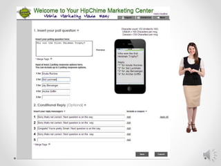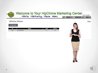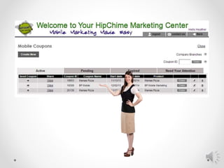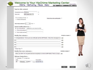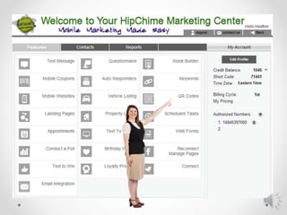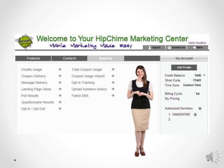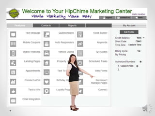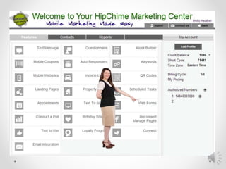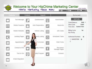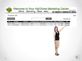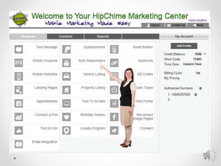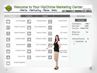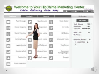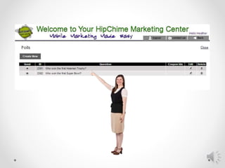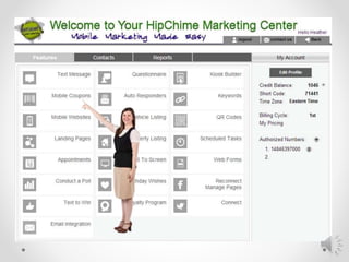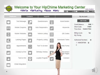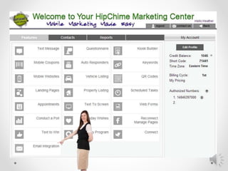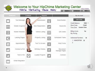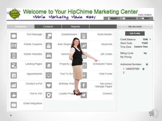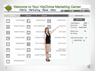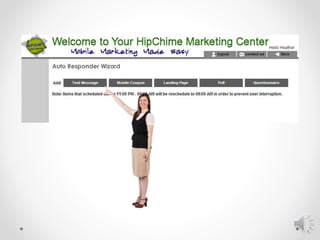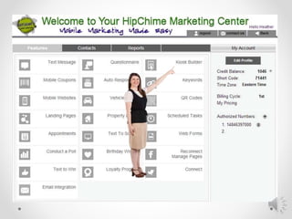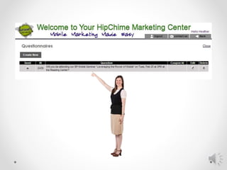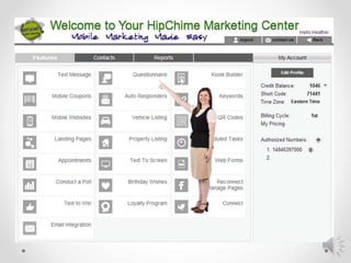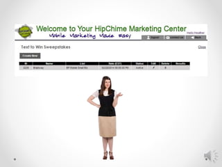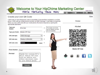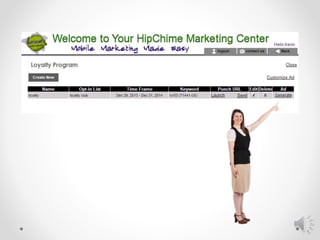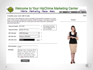 Mobile marketing through the HipChime platform allows marketers to target audiences through their mobile devices, generating new business in a highly targeted way. It produces more immediate responses and higher response rates than any other marketing method. The mobile marketing trend is changing every aspect of marketing. HipChime provides cutting-edge mobile marketing technology, training, and consultation for clients in the US, Canada, and UK.