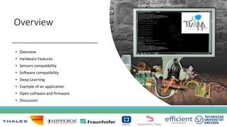 The TSK-Agri is an energy efficient embedded image processing board featuring a Xilinx Zynq UltraScale+ MPSoC processor. It has various I/O including digital, analog and USB ports, compatibility with common sensors and frameworks like ROS and OpenCV, and open source software/firmware. An example application involves computer vision and the board is optimized for tasks like deep learning on neural networks with low power consumption and high performance.