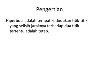 Dokumen tersebut membahas tentang hiperbola, yang merupakan kurva geometri tempat titik-titik yang selisih jaraknya terhadap dua titik tetap. Dokumen tersebut menjelaskan anggota kelompok, pengertian hiperbola, contoh soal, unsur-unsur hiperbola seperti fokus, puncak, asimtot, dan hiperbola yang berpusat pada titik tertentu.