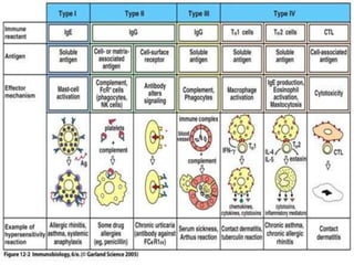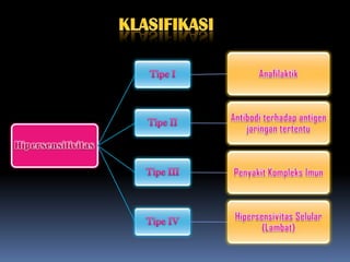 Dokumen tersebut membahas tentang hipersensitivitas atau alergi, termasuk definisi, jenis, mekanisme, gejala, diagnosis dan penanganannya. Hipersensitivitas adalah reaksi berlebihan sistem kekebalan tubuh terhadap zat asing yang biasanya tidak berbahaya. Terdapat empat jenis hipersensitivitas yang berbeda mekanismenya, dan gejala umum meliputi urtikaria, sesak napas, dan gangguan saluran cerna. Diagnosis