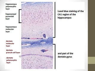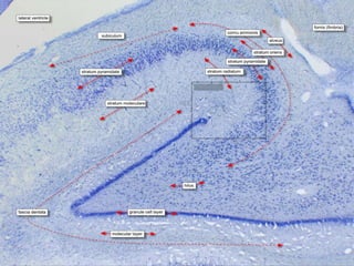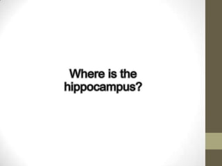 The document summarizes key aspects of the hippocampus. It describes the hippocampus as a curved structure in the medial temporal lobe that plays important roles in memory consolidation and spatial navigation. It notes that humans and other mammals have two hippocampi, one in each side of the brain. It then details the various subregions of the hippocampus, including the Cornu Ammonis regions CA1-CA4 and the dentate gyrus. It provides information on the characteristic cell layers and connections within and between these subregions.