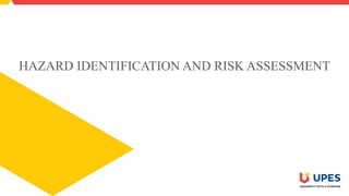 This document outlines the methodology for conducting a hazard identification and risk assessment (HIRA). It describes the objectives of a HIRA as helping to prepare for the most likely hazards, isolate any hazards that cannot affect the community, and create emergency plans based on high risk scenarios. The methodology involves identifying hazards, assessing their risks through analysis of frequency and consequences, determining control measures, implementing controls, and ongoing monitoring and review. As an example, several hazards identified for one site are listed along with their original and residual risk ratings after implementing controls.