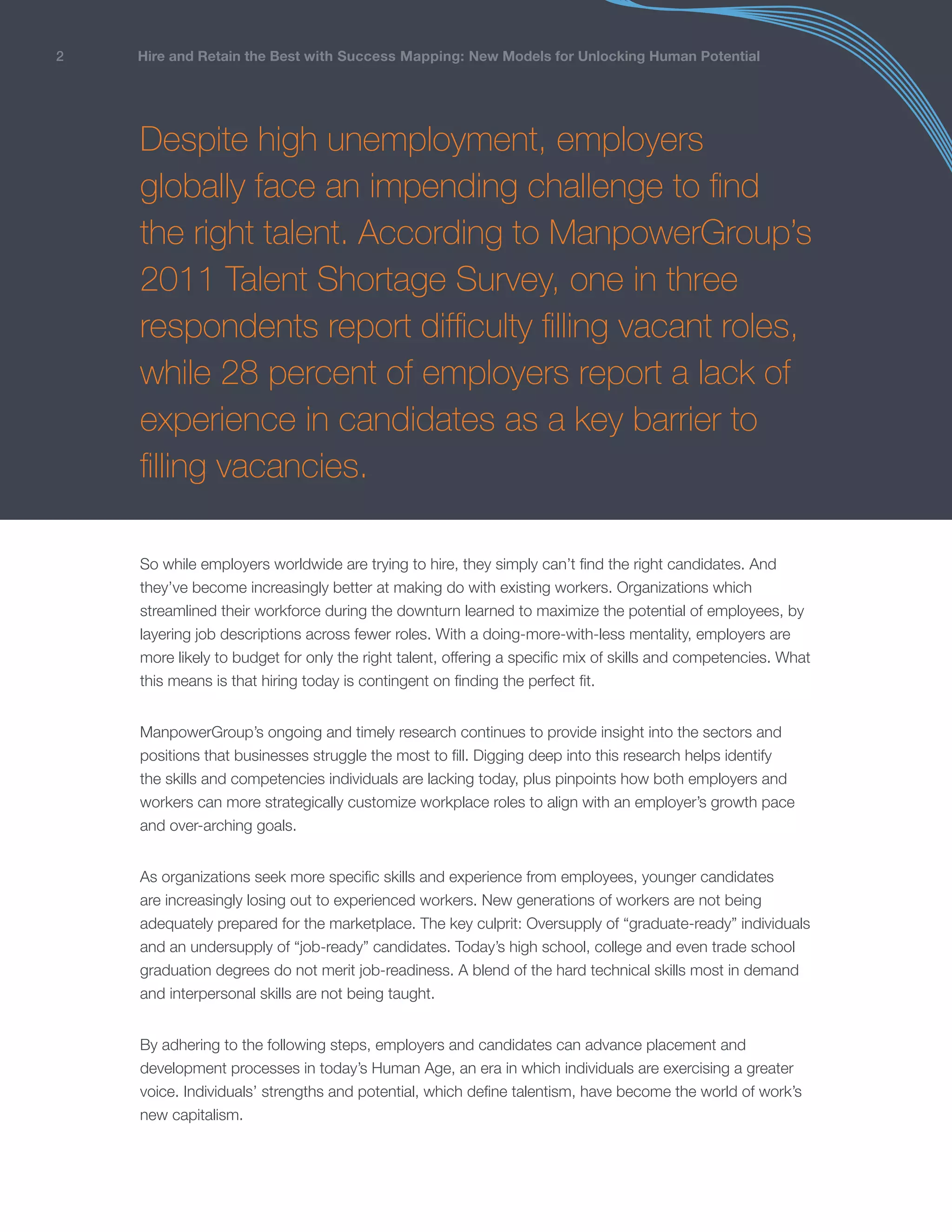 This document discusses how employers can better hire and retain talent. It suggests that employers use "Job Success Profiles" instead of traditional job descriptions. Job Success Profiles map out the mindsets, skills, and competencies needed for a role, how success is defined, and how the role contributes to business goals. This provides more context than job descriptions. Profiles can also be used for career development by showing the skills needed over time. The document provides an example comparing a traditional sales manager job description to a Job Success Profile. It argues that profiles will attract stronger candidates that are a better fit, improving hiring. Profiles also support lifelong learning by mapping career paths and training needs.