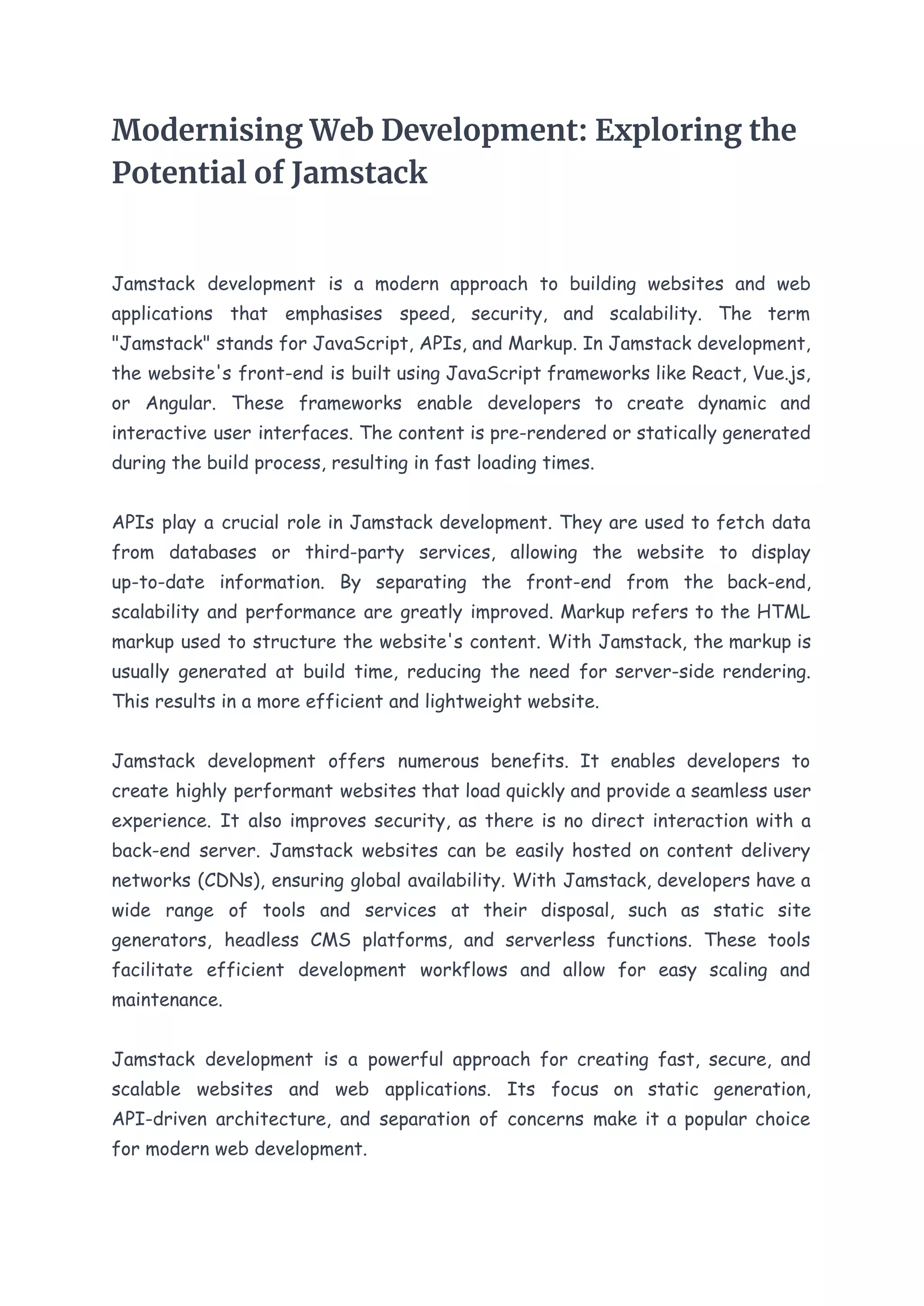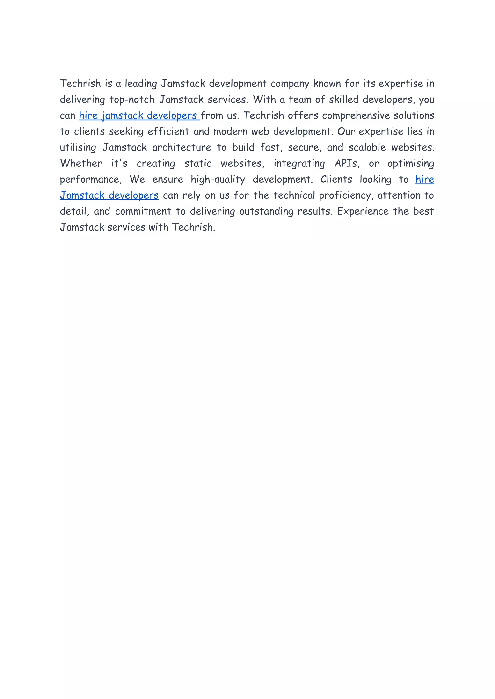 Jamstack development is a modern web development approach focusing on speed, security, and scalability, using JavaScript frameworks, APIs, and markup. It enhances website performance through pre-rendering, separation of front-end and back-end, and improves security by minimizing server interaction. Techrish offers expert Jamstack services, providing businesses with reliable development solutions for creating fast and secure websites.