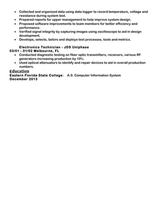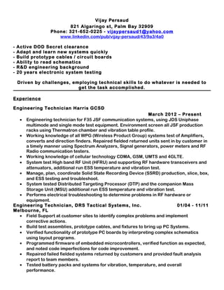 Vijay Persaud has over 20 years of experience in electronic system testing and engineering. He has worked as an engineering technician for Harris Corporation testing F-35 communication systems and other wireless products. Prior to that, he worked as an engineering technician for DRS Tactical Systems building prototypes, testing systems, and providing field support. He has a background in cellular technologies and experience testing systems for vibration and temperature.