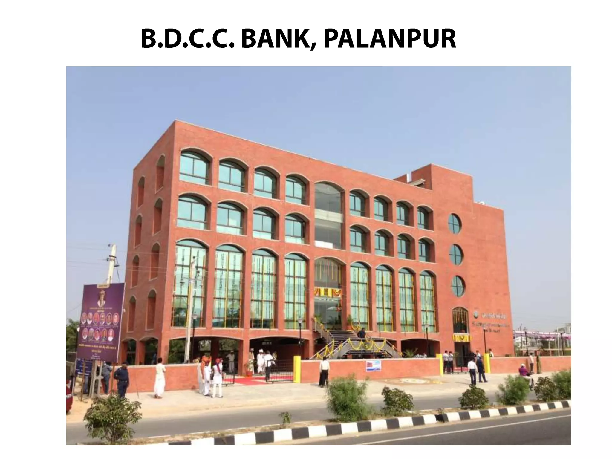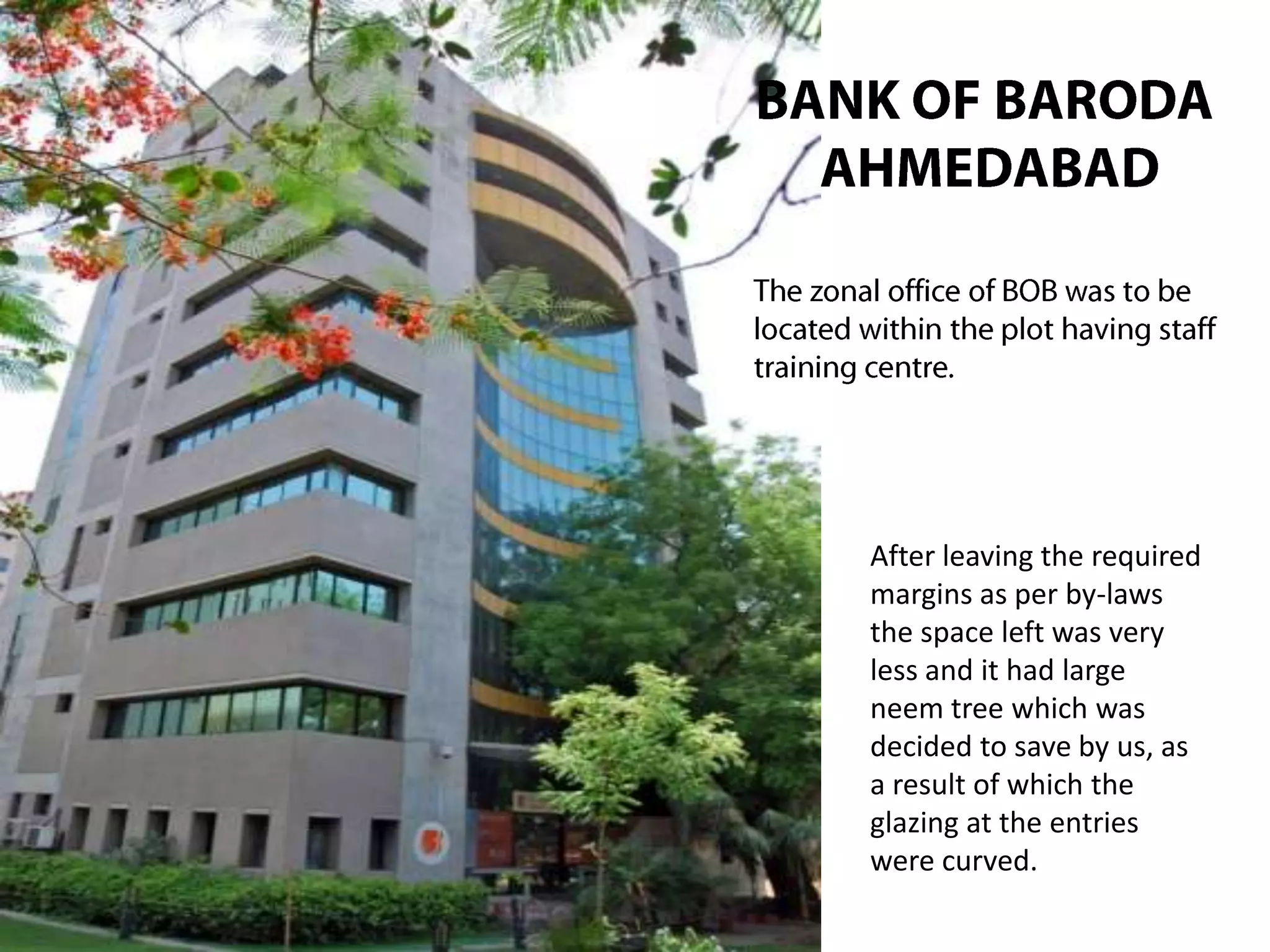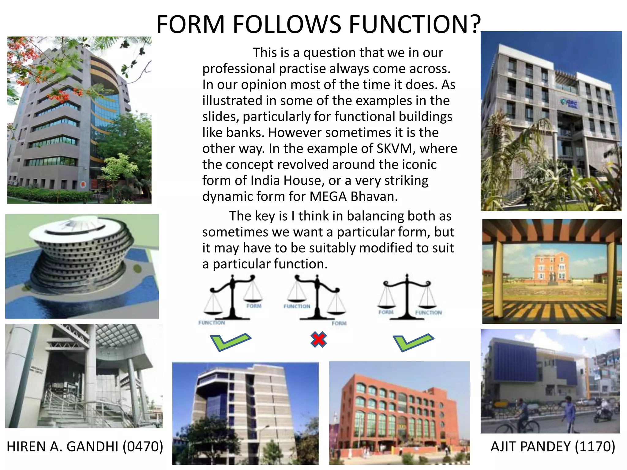 The document discusses various architectural projects, emphasizing the balance between form and function in building design. It highlights the design considerations for banks and public buildings, addressing aspects like energy efficiency, aesthetics, and integration with the environment. Specific examples include designs for the N GSC Bank and NABARD in Ahmedabad, showcasing innovative use of materials and space planning to enhance usability and visual appeal.