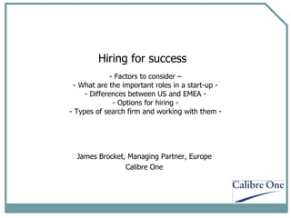 The document discusses important considerations for startups hiring key roles. It covers defining job profiles, finding candidates through various sources like referrals, interviews, and closing candidates. It also compares differences between hiring in Europe vs the US, noting the US talent pool is deeper and there is less margin for error in Europe. Equity ranges for common roles like CEO, CFO, and VP roles are provided as a guide for startups.