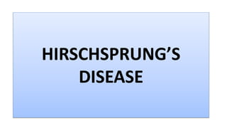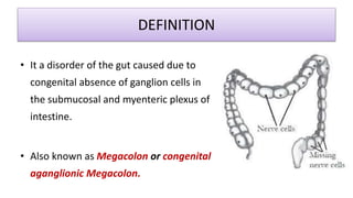 Hirschsprung's disease is a disorder of the gut caused by the congenital absence of ganglion cells in the intestine. It occurs in around 1 in 500 live births and is more common in males. Symptoms in neonates include failure to pass meconium and abdominal distension. In older children, symptoms include constipation and foul-smelling stools. Diagnosis involves tests like barium enema and rectal biopsy. Treatment consists of medical management with enemas or surgery to remove the affected segment and reconnect the intestine. Nursing care focuses on monitoring for complications pre-and post-surgery and providing bowel care.
