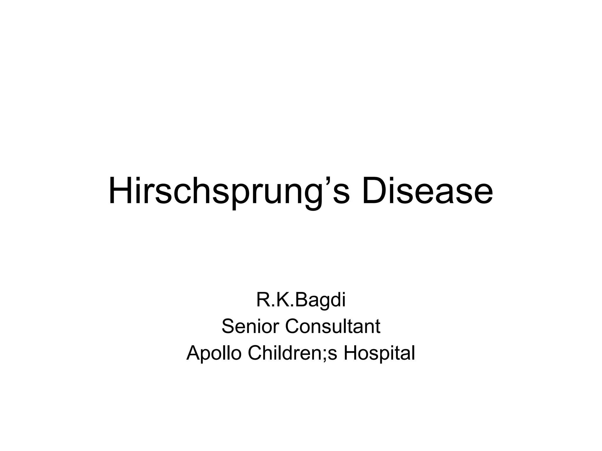 This document discusses the case of a newborn male patient presenting with symptoms of Hirschsprung's disease including abdominal distention and failure to pass meconium. Diagnostic testing revealed the absence of ganglion cells in the colon consistent with Hirschsprung's disease. The patient underwent an end colostomy and biopsy which confirmed the diagnosis. He recovered well and was discharged with plans for a future pull through surgery.