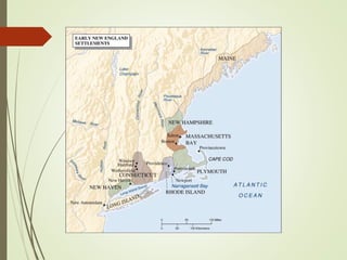 - The Puritans founded the Massachusetts Bay Colony in 1629 seeking religious freedom, led by John Winthrop. Other New England colonies included Plymouth and Rhode Island.