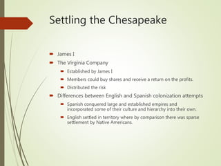 - The founding of Jamestown in 1607 by the Virginia Company in the Chesapeake region, where they encountered the Powhatan people led by Chief Powhatan. John Smith helped the struggling colony survive.