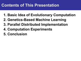 The document summarizes a presentation on improving the scalability of genetics-based machine learning to large datasets. It discusses using evolutionary computation approaches like genetic algorithms for machine learning tasks. A key challenge is the heavy computation required to evaluate fitness on large training data. The presentation proposes approaches like parallel distributed computation, reducing the training data used for each fitness evaluation, and a windowing method where different data subsets are used for fitness evaluation in each generation.