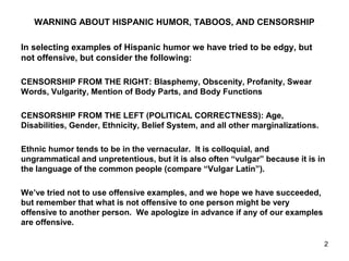 The document provides warnings about offensive content in examples of Hispanic humor. It discusses censorship from both the political right and left as well as how Hispanic humor tends to be colloquial and "vulgar" as it uses common language. The authors have tried to avoid offensive examples in their work but acknowledge what is offensive can vary between individuals.