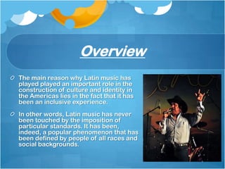Latin music has played an important role in culture and identity across the Americas by being inclusive of all races and social backgrounds. It has absorbed influences from a variety of styles without imposition of standards. Argentina is known for the tango worldwide and rock genres like Rock Nacional and Rock en Español. Mexico has immense musical diversity varying by each of its 31 states. Representative styles include mariachi music, though mariachi musicians perform technically complex blended styles. In Panama, Spanish reggae originated in 1977 and competes with reggaeton, which has Puerto Rican influences like bomba and plena. Latin American music is characterized by its diversity, from lively Central American and Caribbean rhythms to more subdued Southern South American sounds,