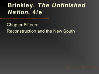 This chapter discusses the Reconstruction era and the emergence of the New South following the Civil War. It covers the challenges faced during Reconstruction in establishing a new social and political order across the South. This included debates around citizenship, civil rights, and economic opportunities for freed black Americans. However, Reconstruction was eventually abandoned as support waned in the North, allowing southern states to impose Jim Crow laws and disenfranchise black citizens despite efforts to integrate them as equal members of society during Reconstruction.