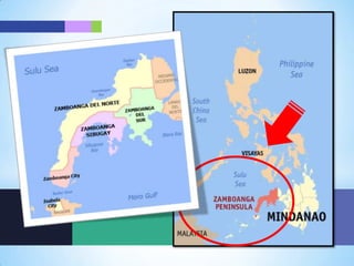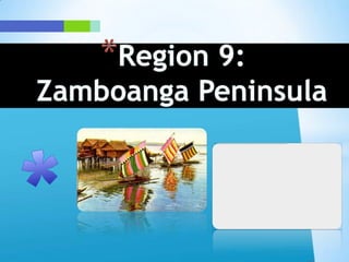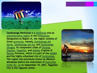 The document provides information about the Zamboanga Peninsula region in the Philippines. It discusses the provinces that make up the region - Zamboanga del Norte, Zamboanga del Sur, Zamboanga Sibugay, and Basilan province's capital of Isabela City. It also discusses the region's largest city, Zamboanga City. Key details include the total land area, population figures, dominant industries of fishing and agriculture, and the major ethnic groups that inhabit the region.