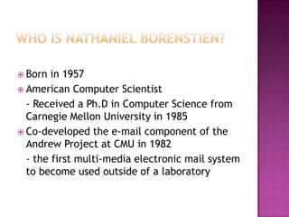 Jimin Kwon is a computer scientist who co-developed the first multi-media email system at Carnegie Mellon University in 1982. In 1992, while working at Bell Communications Research, he sent the first email attachment, a audio file. He is also known for being one of the original designers of the MIME protocol in 1995, which extended email formatting to support multimedia attachments and non-ASCII text and became the standard that the entire email system now relies on. Currently, he works as a Chief Scientist at an email management company.