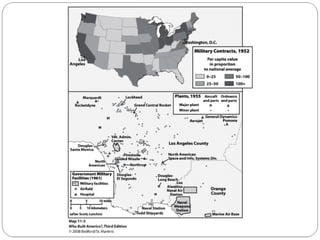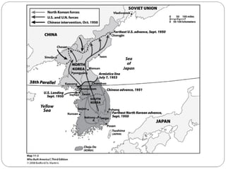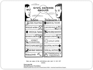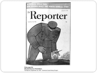 The document is a lecture outline on the Cold War boom period in the United States from 1946-1960. It covers topics such as the origins of the Cold War, the postwar economic boom, suburban expansion, challenges to racial equality, and cultural trends including rising consumerism and the idealization of suburban family life in popular television shows. The outline breaks the content into six parts structured around these major themes and events of the period.
