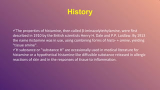 Histamine is a compound involved in local immune responses and regulating various physiological functions. It is produced by basophils and mast cells and released during allergic reactions. Histamine binds to H1, H2, and H3 receptors throughout the body, causing effects like vasodilation, increased capillary permeability during allergic responses, regulation of the sleep-wake cycle as a neurotransmitter, stimulation of gastric acid release, and involvement in conditions like schizophrenia and multiple sclerosis. Histamine plays an important role in many physiological processes through its ability to interact with different receptor types in various tissues and organs.