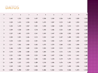 The document contains raw data in the form of numbers organized in a table. There are 300 numbers ranging from 1.393 to 1.590. Various statistical analyses were performed on the data including calculating measures of central tendency (the mean is 1.4985), dispersion (the standard deviation is 0.03634812), and others. A histogram of the data is also presented.