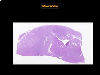 Il documento descrive la struttura e le caratteristiche del miocardio, evidenziando l'importanza dei nuclei e dei dischi intercalares nelle fibre muscolari. Viene menzionata anche la presenza delle fibre di Purkinje, che sono importanti per la conduzione elettrica del cuore. L'analisi è presentata attraverso un taglio longitudinale del miocardio con ingrandimenti di 40x.
