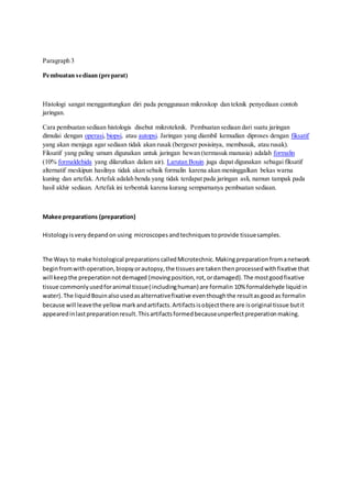 Histologi adalah ilmu yang mempelajari struktur jaringan secara detail menggunakan mikroskop dan berperan penting dalam memahami fungsi sel serta diagnosis penyakit. Proses pembuatan sediaan histologi melibatkan teknik mikroteknik, penggunaan fiksatif, dan dehidrasi jaringan, dengan langkah-langkah terperinci. Klasifikasi jaringan hewan dalam histologi mencakup epitelium, endotelium, mesotelium, dan berbagai tipe lainnya, mencerminkan keragaman struktur jaringan yang ada.
