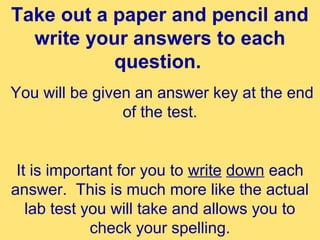 The document is a practice quiz for a histology lab containing 37 multiple choice questions about various tissues including epithelial, connective, and muscle tissues. Students are instructed to write down their answers on paper to practice for the actual lab test and allow them to check their spelling. The quiz concludes by informing students that the answer key is provided on the next slide.