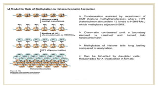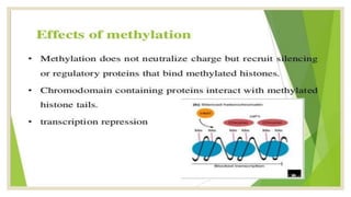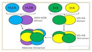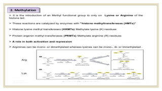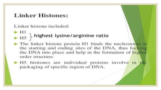 Histones are positively charged proteins that DNA wraps around to form nucleosomes, the basic unit of chromatin. The four core histones, H2A, H2B, H3, and H4, contain high proportions of lysine and arginine amino acids. H2A, H2B, and H1 contain more lysine while H3 and H4 contain more arginine. Histone modifications like acetylation and phosphorylation can regulate gene expression by altering chromatin structure and accessibility to transcription proteins. Acetylation reduces the positive charge of histones and weakens their interaction with DNA, allowing transcription. Phosphorylation also weakens histone-DNA interactions and influences chromatin structure and cellular processes like DNA