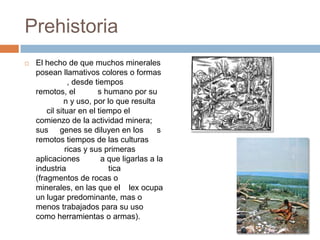 El documento resume la larga historia de la minería humana, desde las primeras herramientas de piedra y minerales hasta el desarrollo de la metalurgia y las edades del cobre, bronce e hierro. Explica que la minería ha sido fundamental para el progreso tecnológico a lo largo de la historia y ha influido en importantes épocas como la Revolución Industrial y la era moderna.