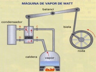 A industrialización: afábrica e a mecanización. · O sistema artesanal. · Sistema de fábrica: · - Fábrica. · - Máquinas. · - Nova fonte de enerxía. · - Máquina de vapor (James Watt). · Consecuencias: · - Concentración. · - División do traballo. · - Aumento de produtividade. · - Diminución dos precios dos produtos.