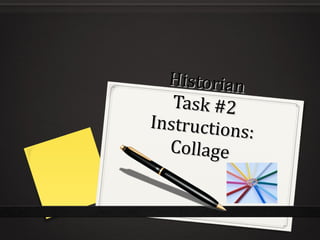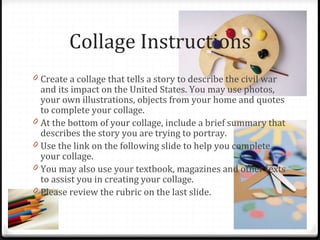 This document provides instructions for a history student assignment to create a collage telling the story of the US Civil War and its impact. Students are told to use photos, illustrations, objects, and quotes in their collage and include a brief summary at the bottom describing the story. A link is provided to assist with the collage, and students can also use textbooks, magazines, and other sources. The document concludes with information that a rubric for grading the assignment is available on the last slide.