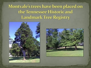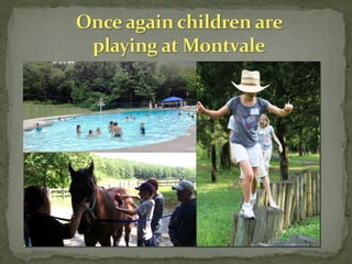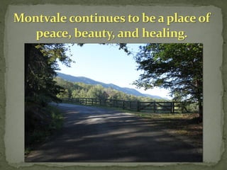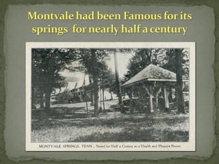 Montvale Springs, established in the early 1830s, evolved from a site where deer attracted hunters to a well-known resort featuring hotels, including the notable Seven Gables Hotel. The area is marked by historic trees and remnants of hospitality, including praised mineral waters and renowned cuisine. Today, Montvale continues its legacy as the Harmony Family Center, offering accommodations and community support for families.