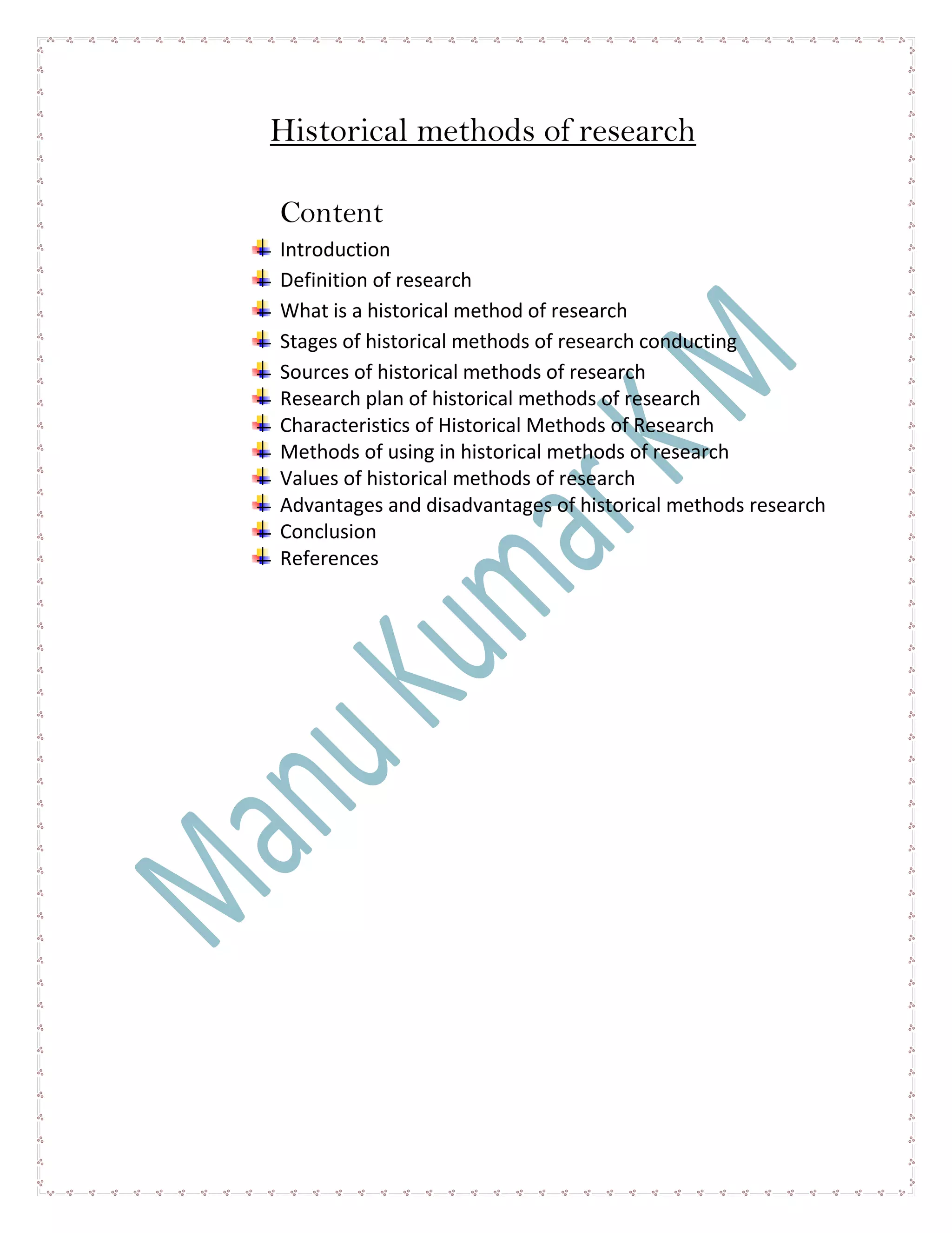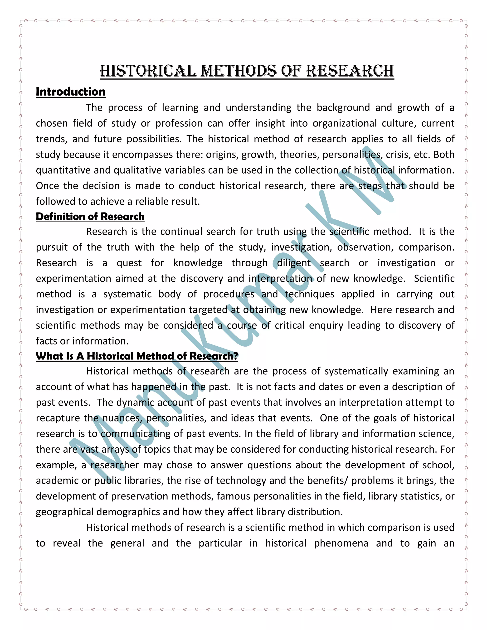 Historical methods of research involve systematically examining accounts of past events through primary and secondary sources to develop an interpretation. There are several key steps, including identifying a topic, conducting background research, analyzing sources through external and internal criticism, and developing a narrative. While it cannot control variables like other methods, historical research helps understand contemporary issues, illuminate cultural interactions, and reevaluate existing theories about the past.
