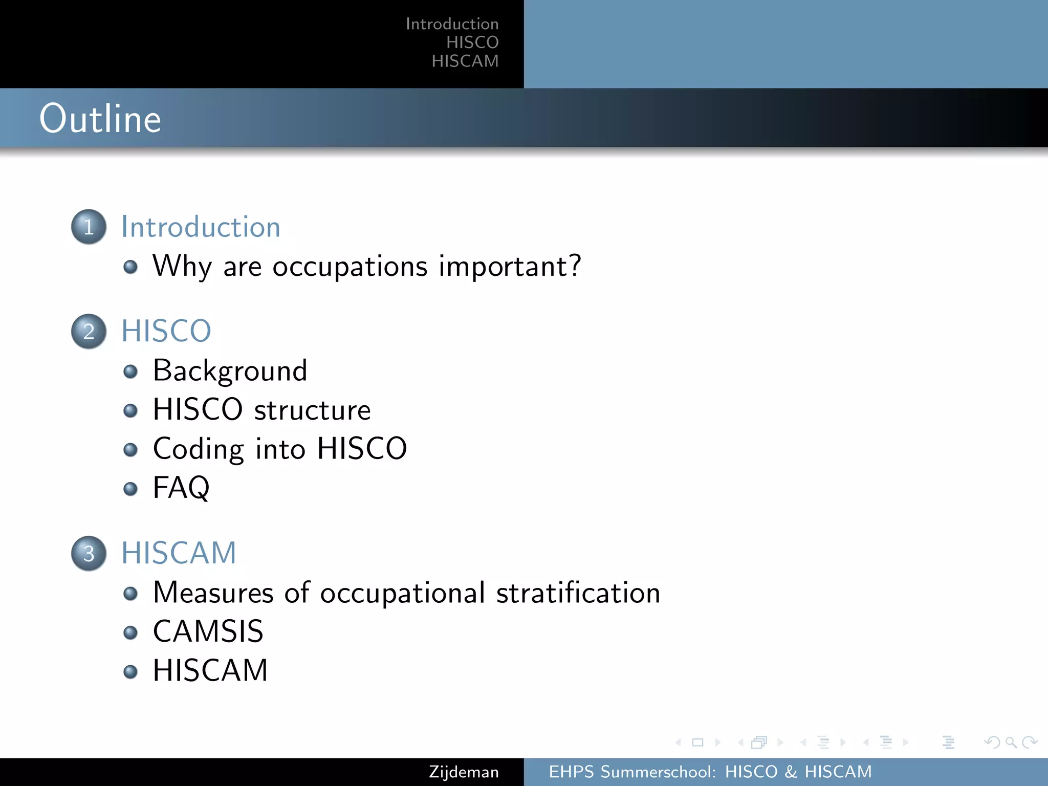 The document discusses the HISCO and HISCAM systems for historical occupational classification and stratification, emphasizing the importance of occupations in understanding social inequality and analyzing historical data. It outlines the structure of HISCO, including the coding of occupational categories and examples, as well as subsidiary classifications related to status and relationships. Additionally, it covers HISCAM's measures of occupational stratification, including various classification systems and their applications in historical research.