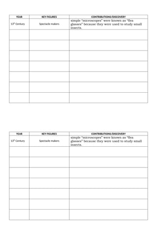 The document outlines the history of the microscope, starting from the 13th century with spectacle makers creating lenses for 'flea glasses' to study small insects. Key developments include the creation of the first microscope by Zacharias and Hans Janssen in the 1590s, Galileo's improvements in 1625, and Antonie van Leeuwenhoek's single-lens microscope in 1674. Notable advancements continued with Richard Zsigmondy's ultra-microscope in 1925 and Fritz Zernike's phase-contrast microscope in 1932, leading to modern microscopy techniques.