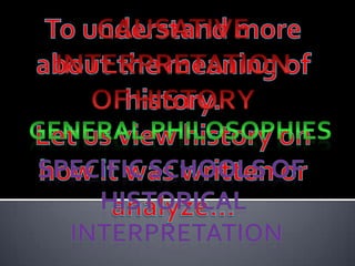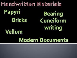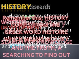 This document discusses various aspects of historical research methodology. It outlines different types of historical sources including written sources like records, autobiographies and legal documents as well as artifacts. It also discusses the characteristics of historical research, including the inability to repeat experiments and reliance on secondary sources. Several methods of analyzing historical documents are provided, such as external and internal criticism to evaluate authenticity. The purpose of these analyses is to detect forgeries and inaccuracies.