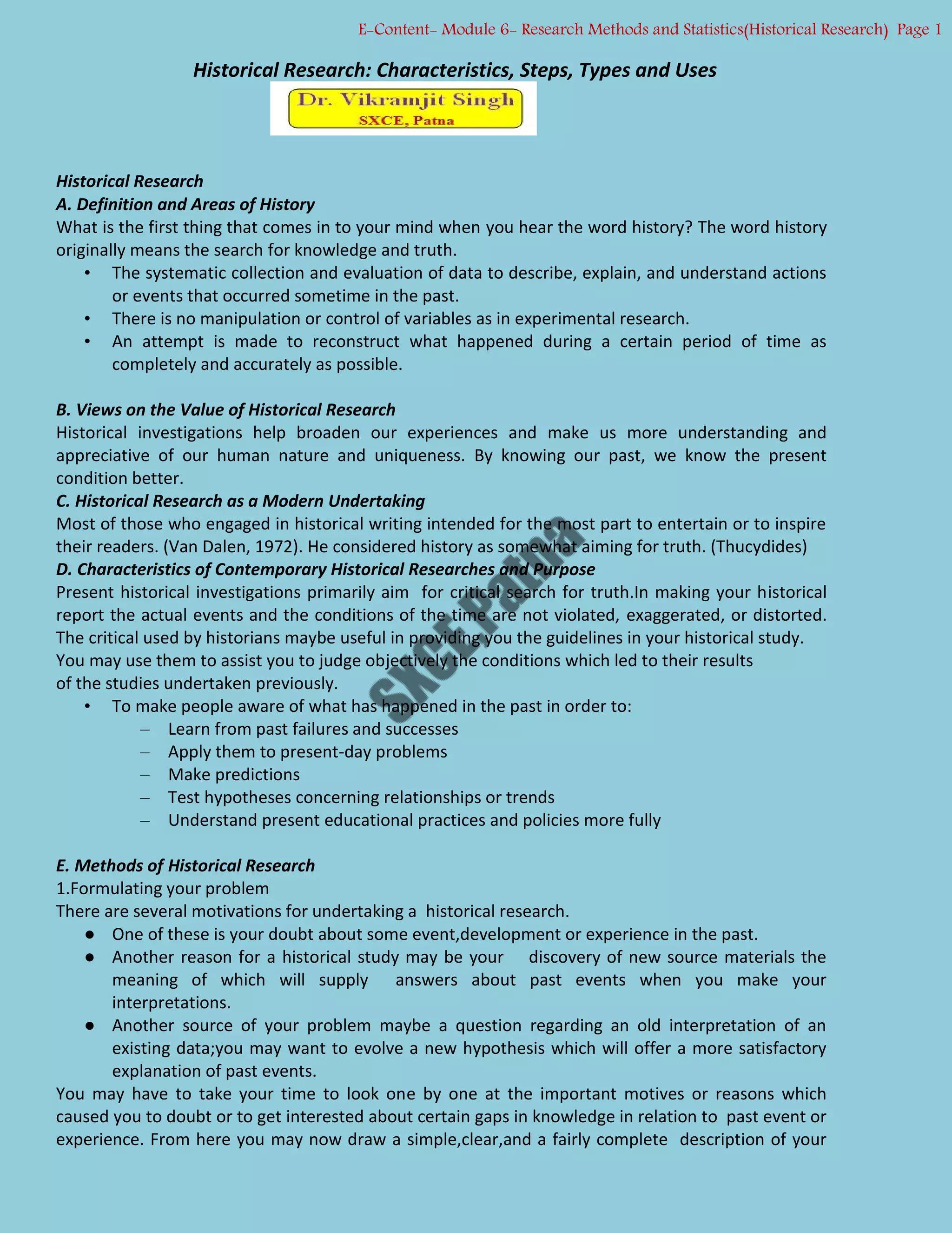 Historical research involves the systematic collection and evaluation of data to understand events from the past without manipulating variables. It aims to reconstruct history accurately and its value lies in enhancing understanding of human nature and informing present contexts. Types of historical research include event, process, comparative, and their strengths and weaknesses are discussed, highlighting issues like biases and methodological challenges.