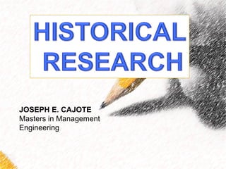 This document outlines the key aspects of historical research. It defines historical research as the systematic collection of data to describe, explain and understand past events without manipulation of variables. The purposes of historical research include learning from past successes and failures, seeing if past approaches could apply to current problems, assisting in prediction, and testing hypotheses. The steps involve defining the problem, locating relevant historical sources like documents and oral statements, summarizing and evaluating these sources, and presenting interpretations of the information. Primary sources are created by direct witnesses, while secondary sources describe events through others. Historical research allows investigating unique topics but comes with difficulties controlling for threats to validity.