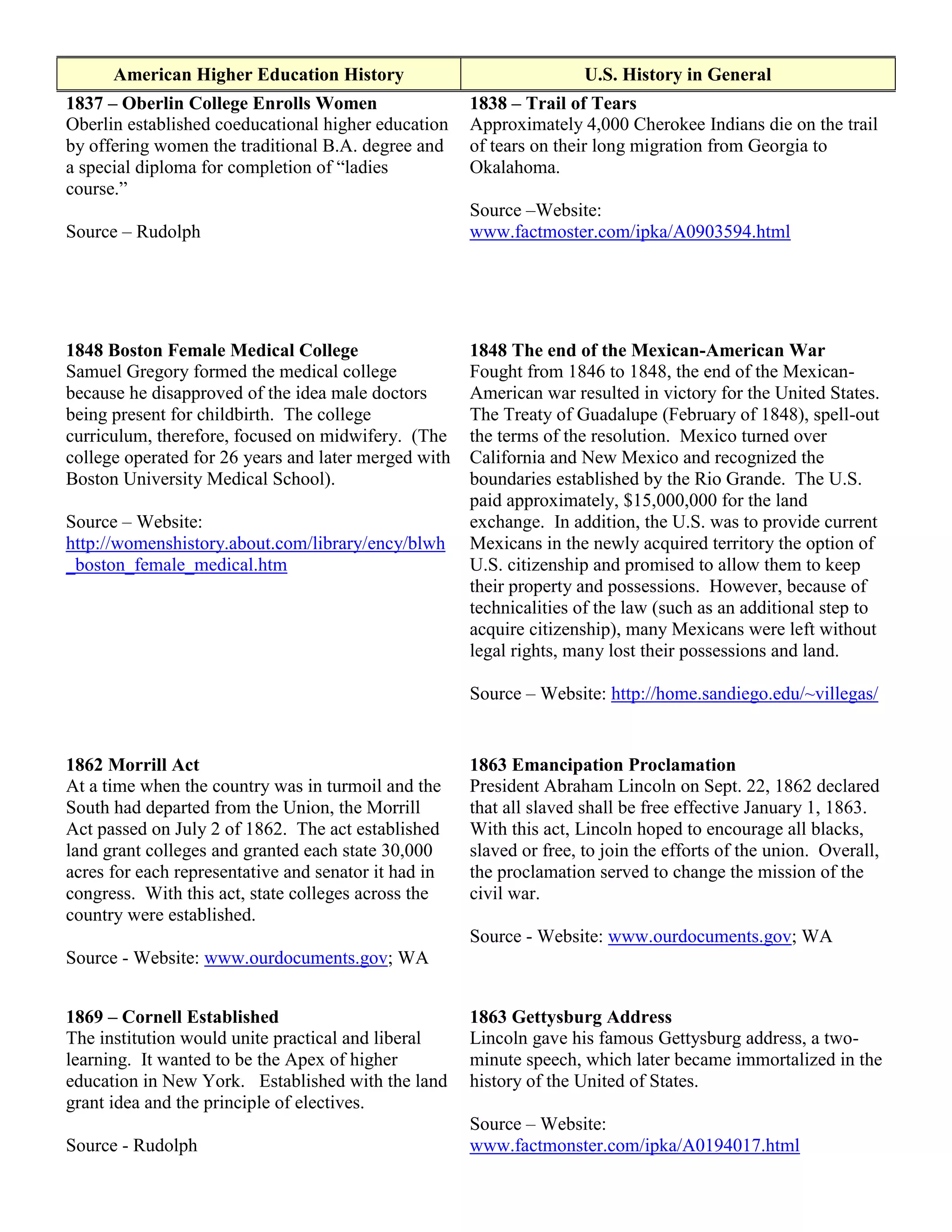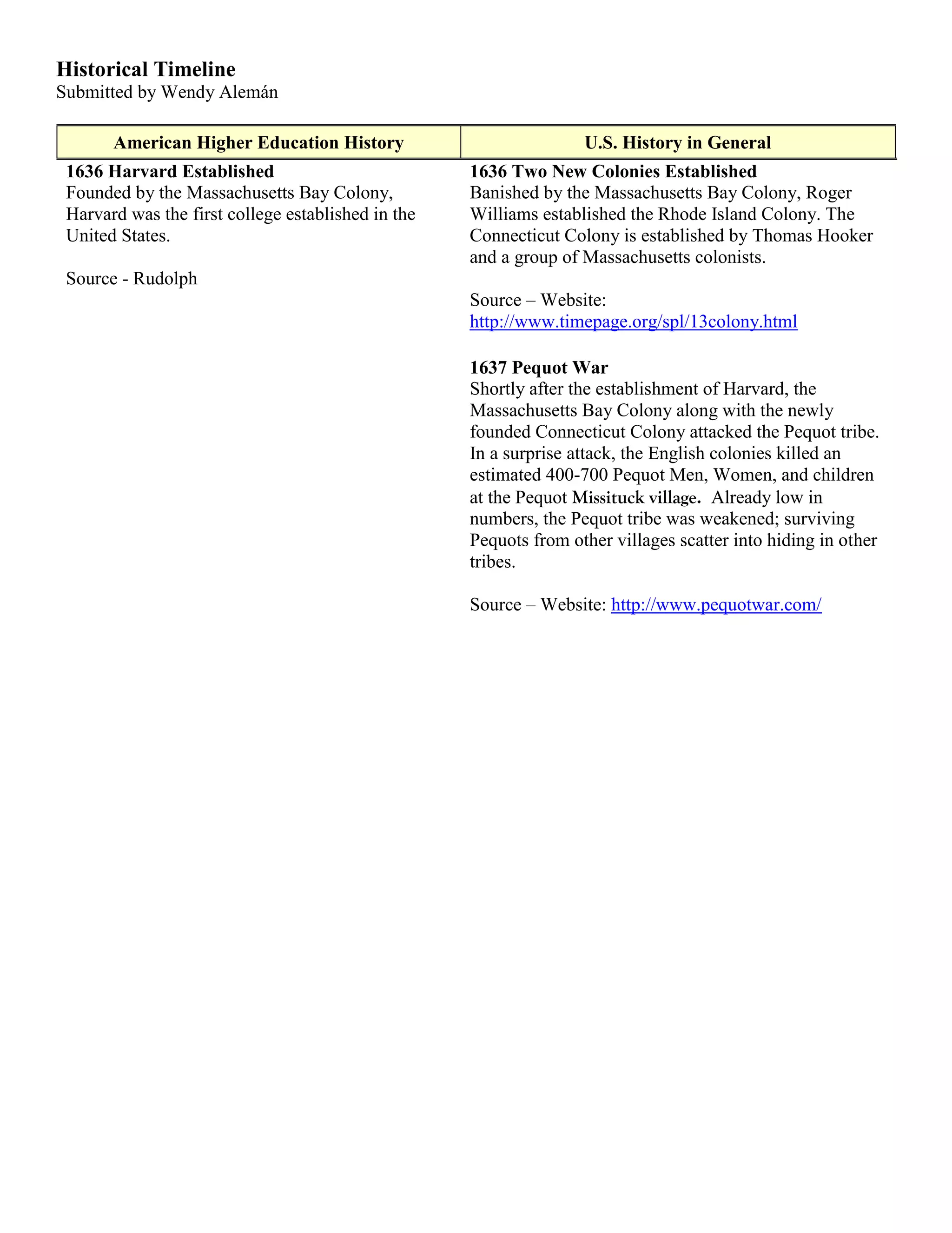 The document provides a historical timeline comparing important events in American higher education history and general U.S. history from 1636 to 1972. Some key events include the establishment of Harvard College in 1636 as the first institution of higher education in America, the Morrill Act of 1862 which established land grant colleges, the GI Bill of 1944 which expanded access to higher education for veterans, Brown v. Board of Education in 1954 which ended school segregation, and the Higher Education Act of 1972 which prohibited discrimination in higher education based on gender and parental status.