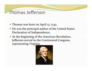The document provides brief biographies of several famous historical figures including Thomas Jefferson, Isaac Newton, George Washington, Christopher Columbus, and Albert Einstein. It notes key facts about each person such as their dates of birth, major accomplishments, and contributions to history or science.