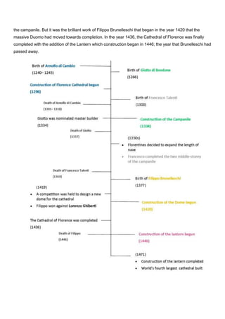 It was during the 14th century that the Gothic style of the late Middle Ages transitioned to the Renaissance in Europe. This period known as the Renaissance, meaning "rebirth" in French, saw many new architectural marvels constructed, including the Basilica di Santa Maria del Fiore in Florence, Italy, also known as Florence Cathedral. Construction of the cathedral began in 1296 under Arnolfo di Cambio and continued over centuries, with key contributions from Giotto, Talenti, and Filippo Brunelleschi, who solved the issue of constructing the massive dome. The domed cathedral stands as a symbol of beauty and inspiration in Florence.