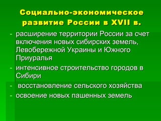В начале нового времени Россия под руководством первых Романовых претерпела социально-экономическое развитие, включая расширение территории и восстановление хозяйства после Смутного времени. Внешняя политика сосредоточилась на укреплении статуса России и возвращении утраченных территорий, что привело к нескольким войнам с соседними государствами. Период также был отмечен внутренними конфликтами и восстаниями, отражая сложные преобразования в обществе XVII века.